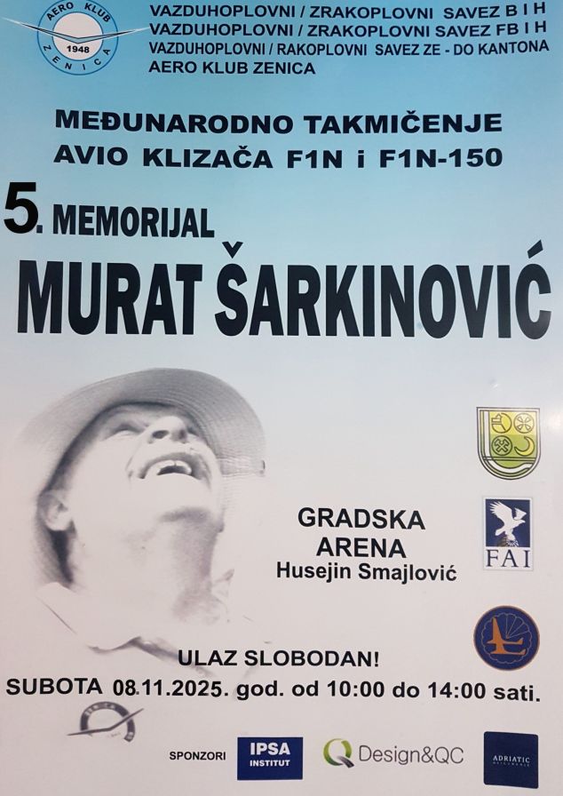 | U zeničkoj Areni “Husejin Smajlović” u subotu, 5. novembra, održano je međunarodno takmičenje u aero-modelarstvu 5. Memorijal “Murat Šarkinović”, u organizaciji Aero kluba Zenica. Takmičenje je održano u disciplinama dvoranskih klizača – kategorijama F1N i F1N-150, koje zahtijevaju veliko znanje, preciznost i tehničku vještinu. Na ovom sportskom događaju učestvovalo je više od 70 takmičara iz pet zemalja – Srbije, Hrvatske, Mađarske, Latvije i Bosne i Hercegovine. Po prvi put se u kategoriji dvoranskih klizača takmičio i Aero klub Bihać, dok su, pored domaćina AK “Zenica”, Bosnu i Hercegovinu predstavljali i članovi Aero kluba “Izet Kurtalić” iz Visokog. U konkurenciji seniora, najuspješniji domaći takmičar u kategoriji F1N bio je Admir Subašić, koji je zauzeo 22. mjesto u izuzetno jakoj međunarodnoj konkurenciji. U kategoriji F1N-150 najbolji plasman među zeničkim seniorima ostvario je Igor Borojević, osvajanjem 25. mjesta. U konkurenciji “Dame” posebno se istakla Aida Šarkinović, koja je u kategoriji F1N zauzela 4. mjesto. Zenički Aero klub i ovoga puta pokazao se kao izvanredan domaćin i organizator, a takmičenje je proteklo u sportskom duhu, fer atmosferi i prijateljskom okruženju. Više detalja o ovom takmičenju možete naći na web stranici www.zenicablog.com.